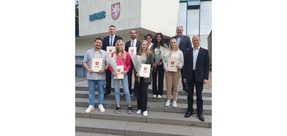 Bildunterschrift (v.r.): Bürgermeister Kai Louis, Personalleiter Carsten Cordewener sowie Erika Voß-Wählen, 1. Vorsitzende des Personalrates (Mitte hinten), begrüßen die neuen Nachwuchskräfte