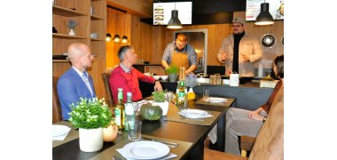 Das Team von „frischMarie“ (hinten) erläutert Bürgermeister Kai Louis (li.) sowie Stephan Otto und Silke Krupke vom Gewerbe- und Verkehrsverein ihr Geschäftskonzept