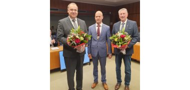 Bildunterschrift: Bürgermeister Kai Louis (Mitte) gratuliert seinen neuen Stellvertretern Siegfried Jansen (rechts) und Johannes Geiser (links)