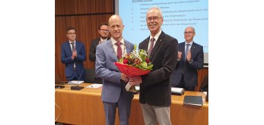 Bildunterschrift: Der Altersvorsitzende des Rates Helmut Frenken (re.) gratuliert Bürgermeister Kai Louis zur zweiten Amtszeit