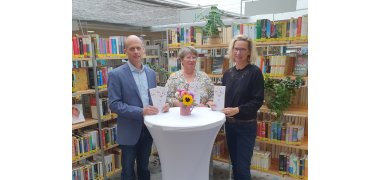 Bildunterschrift (v.li.): Bürgermeister Kai Louis, Christine Kind, Ökumenischer ambulanter Hospizdienst Regenbogen, und Sabrina Wallek, Stadtbücherei Heinsberg