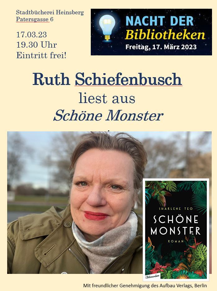 Die Kölner Schauspielerin (Theater, Film, Radio) Ruth Schiefenbusch liest am 17. März 2023 um 19.30 Uhr in der Stadtbücherei Heinsberg, Patersgasse 6. Eintritt frei!